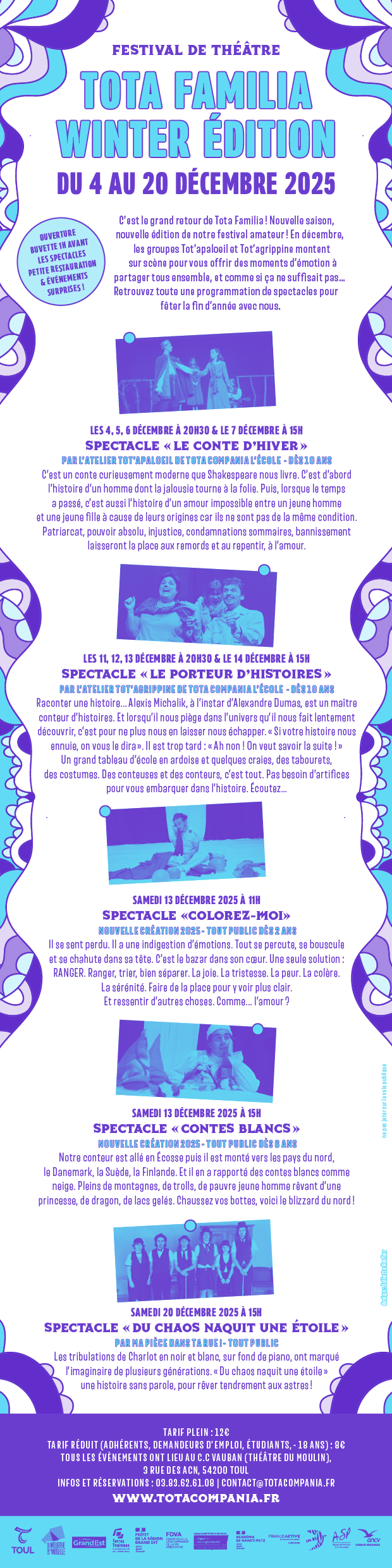 Tous les ans en juin et novembre, les amateurs de Tota Compania montent sur scène pour reprendre les classiques du théâtre. Plus de 80 paires de pieds sur scène, plus de 1500 spectateurs, sous le signe du partage, du rire, de l’émotion !